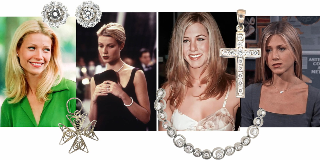 The alternative to grunge was a “clean” aesthetic seen on the likes of Gwyneth Paltrow and Jennifer Anniston (Rachel Green on Friends). Gwynnie and Jen’s jewellery was effortless and wearable. The look featured slim chain necklaces, tiny hoops or teeny diamond studs, understated tennis bracelets, and thin bangles usually worn alone.